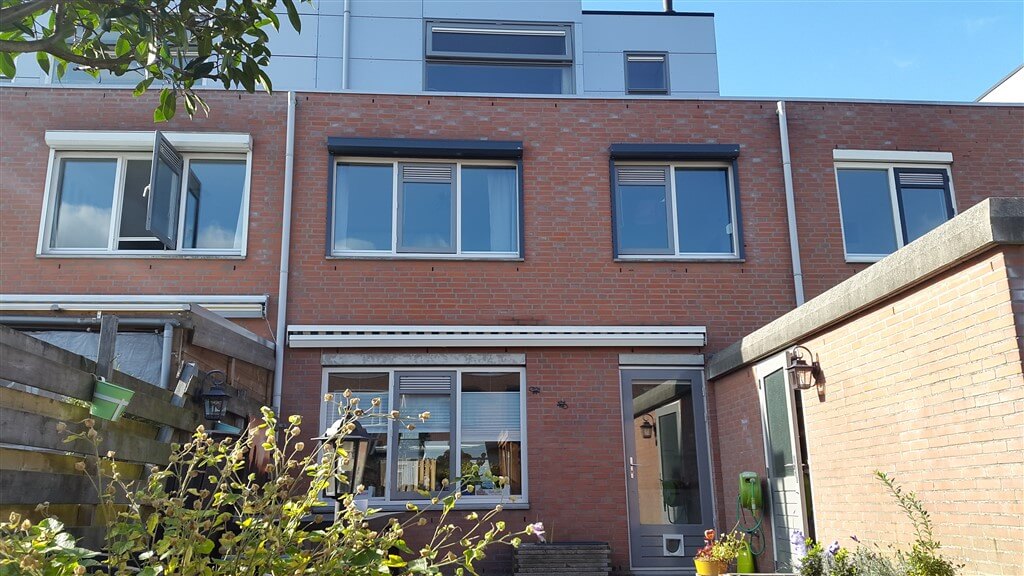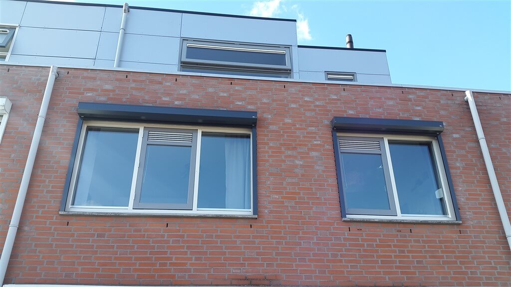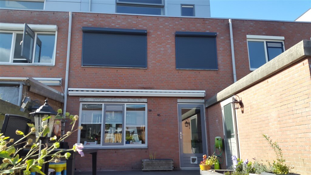 Schaduw Zonwering heeft twee handbediende rolluiken geplaatst op de 1e verdieping van een ééngezinswoning in Amersfoort. De rolluiken zijn te bedienen met een bandopwinder aan de binnenzijde. De rolluiken zijn gemonteerd met LHTF profielen 'in de dag' hierdoor komt de bak boven het kozijn en kan de bandbediening door het kozijn geboord worden i.p.v. door de gevel.