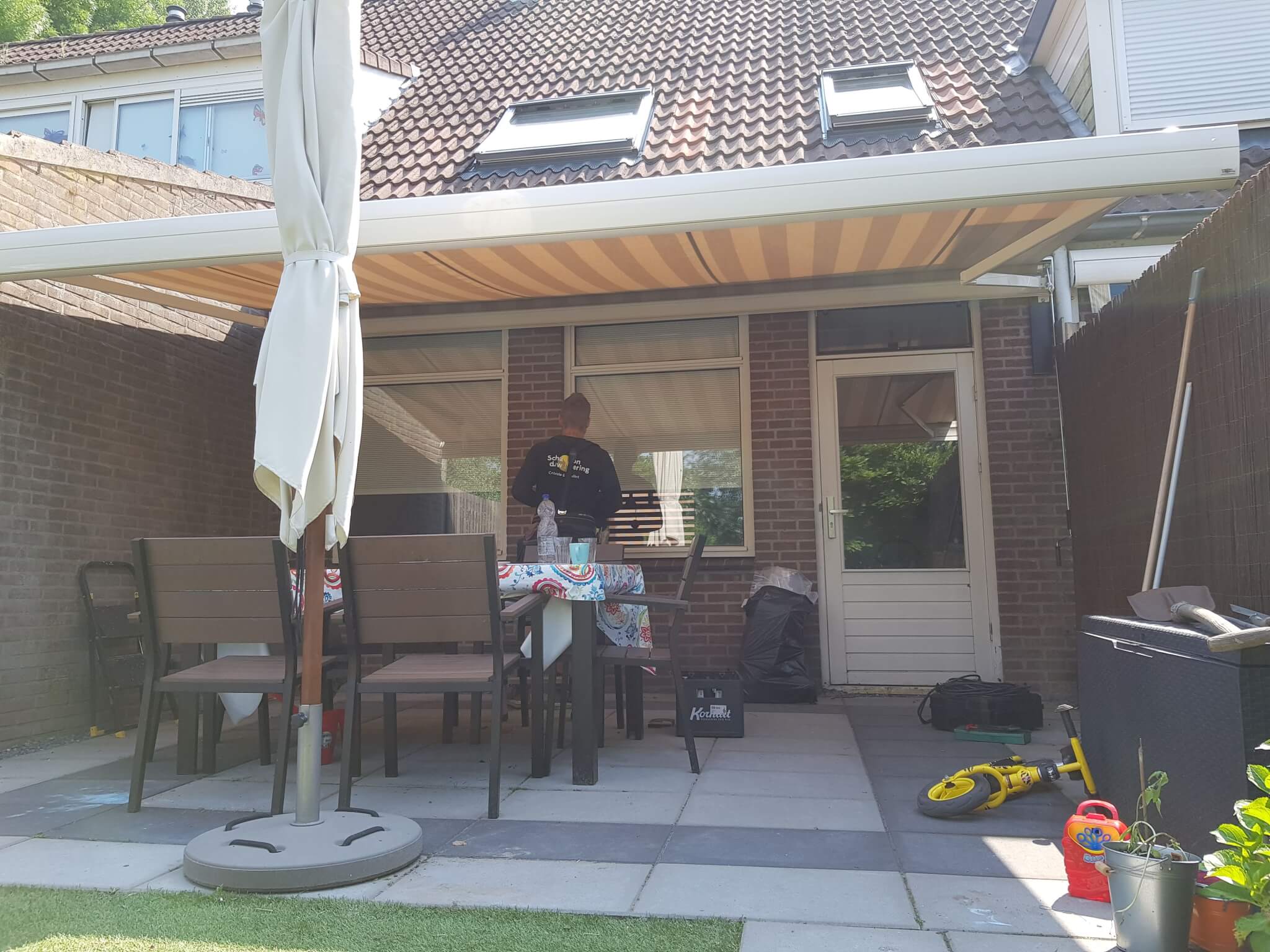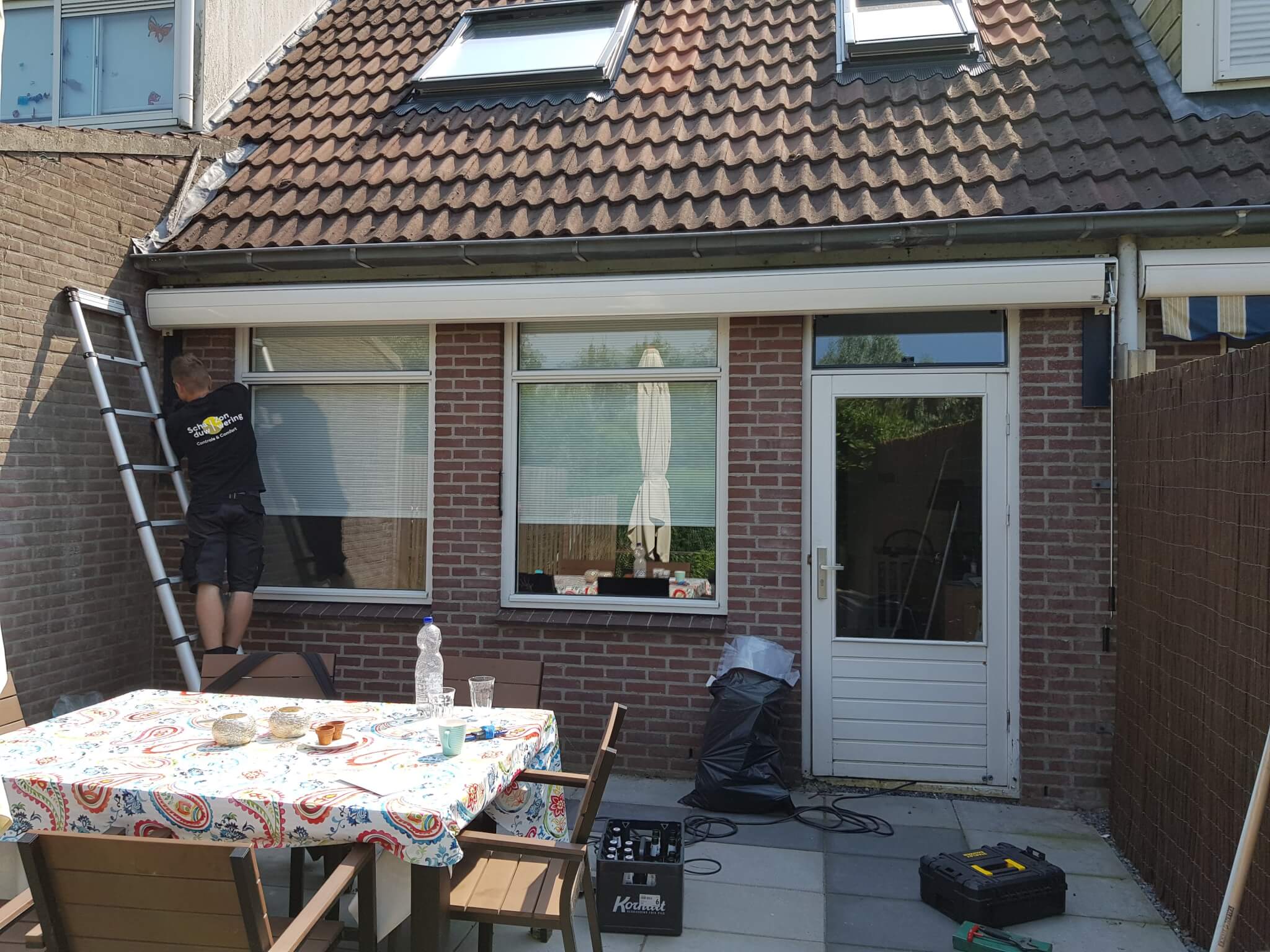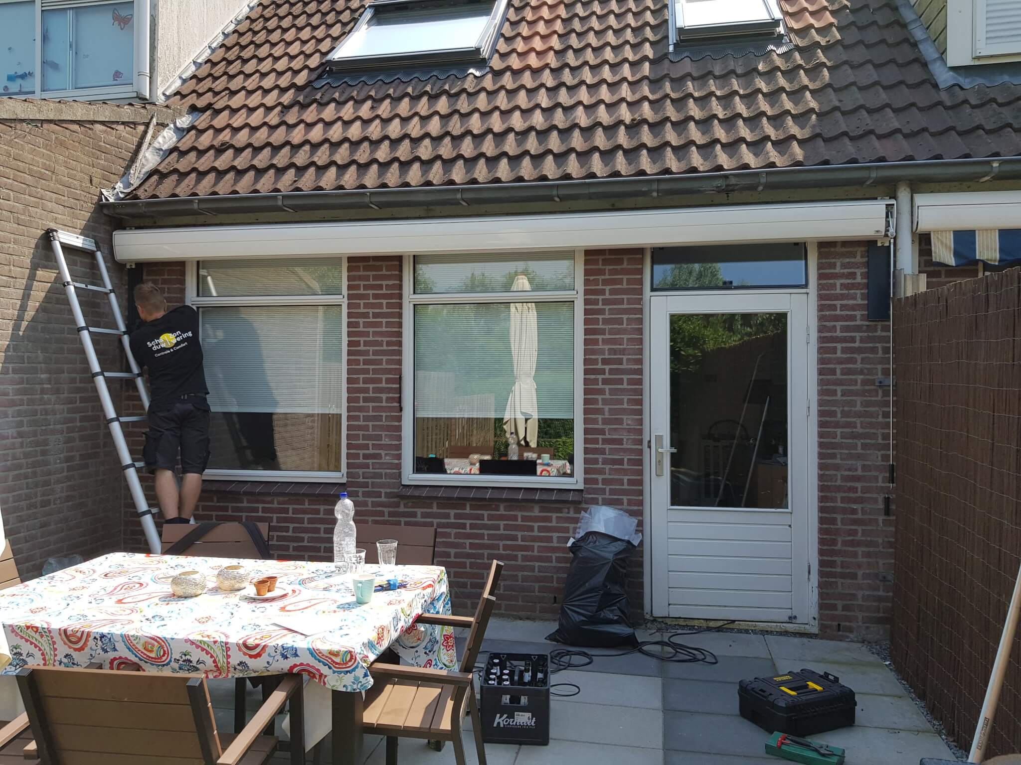 Op deze dag hebben we een Verano Salou knikarmscherm geplaatst aan deze woning in De Meern. Het knikarmscherm is geplaatst op aluminium muurstrips voor extra versteviging. De cassette is geleverd in een crème witte kleur en komt met handbediening. Met dit Verano Salou knikarmscherm bepalen de bewoners zelf hoeveel graden de hellingshoek van het doek is. Op deze manier zorgen de bewoners ervoor dat ze altijd op hun gemak in de tuin kunnen zitten en de doorloophoogte is afgesteld op hun lengte.