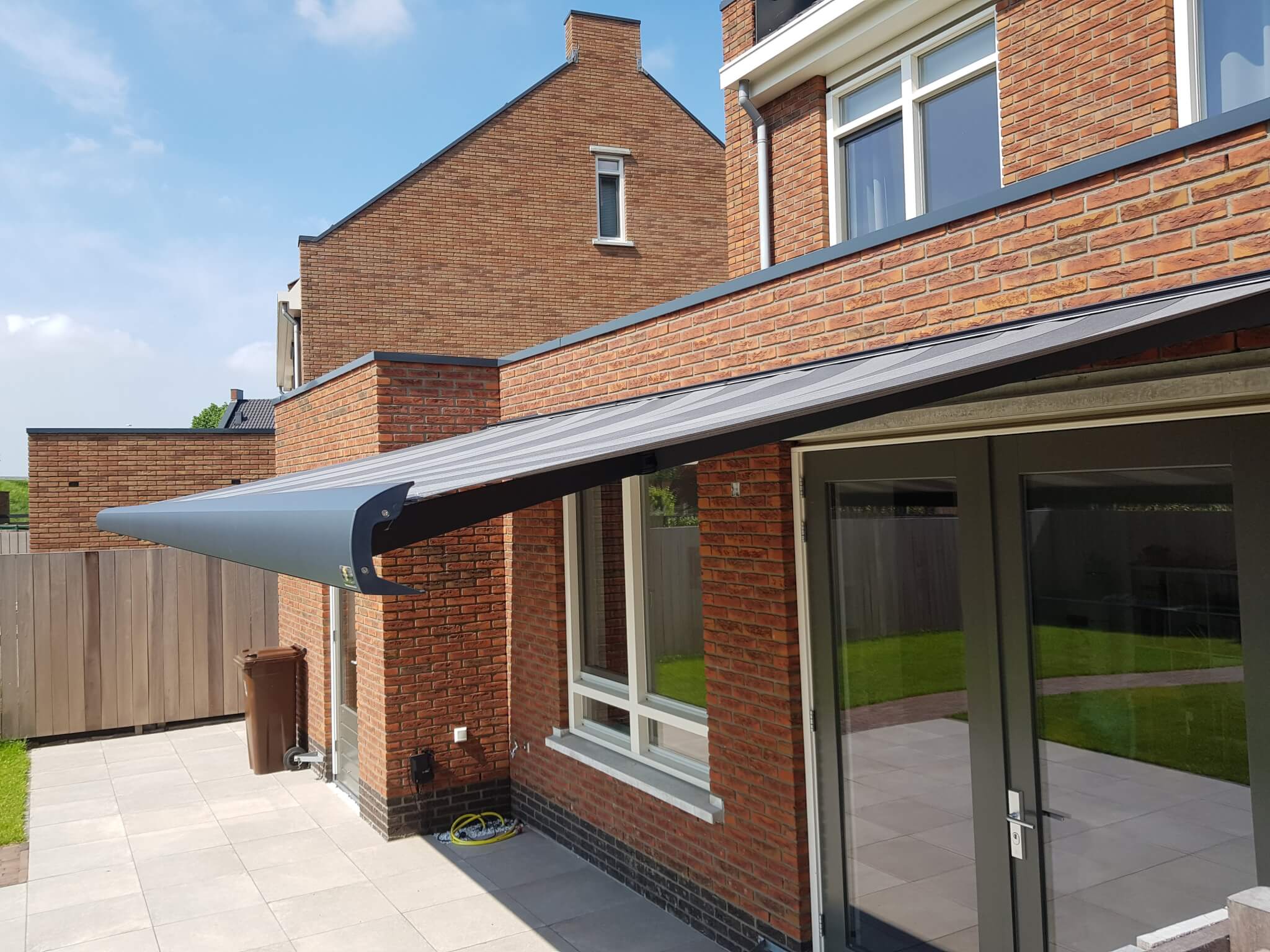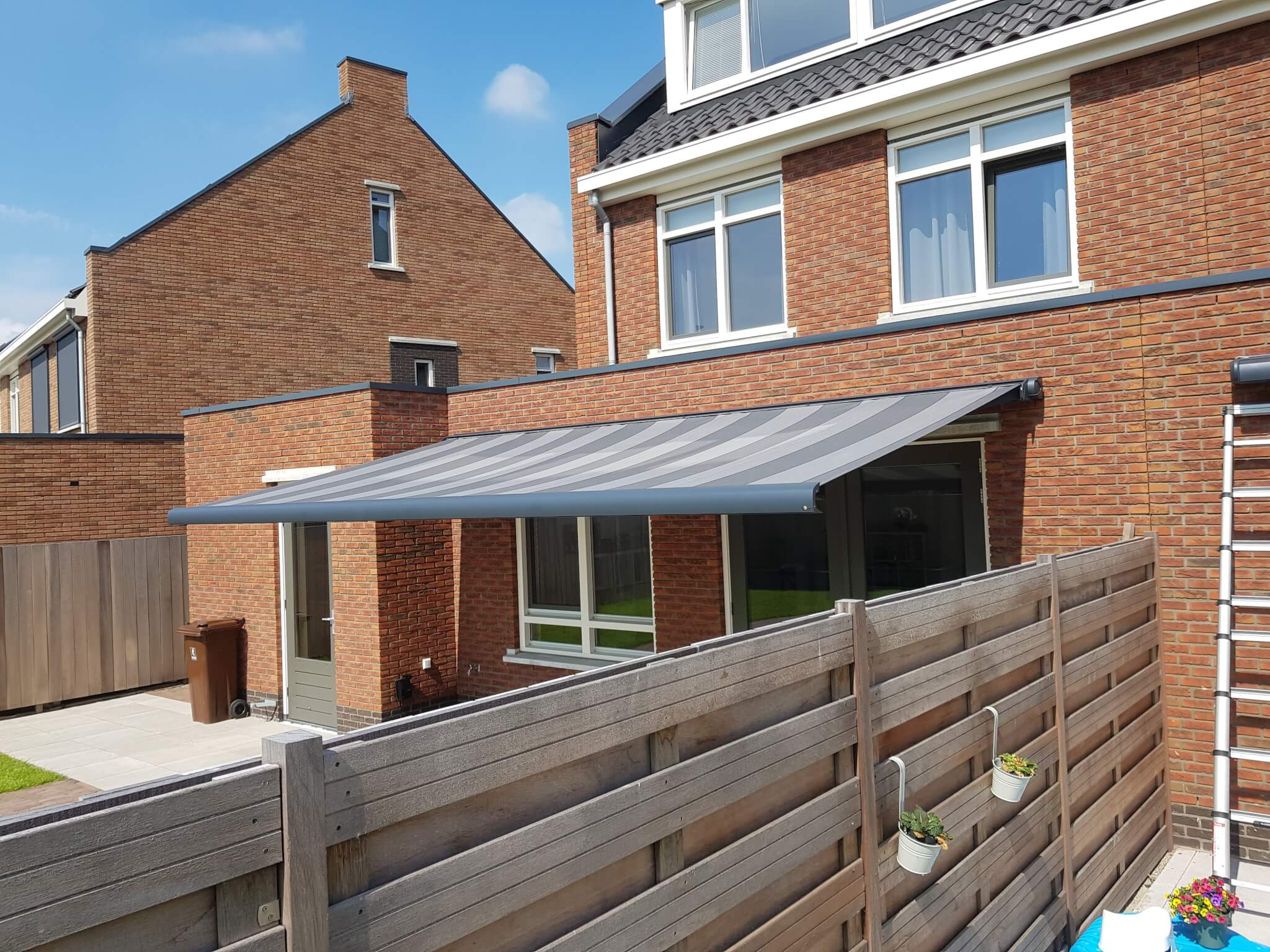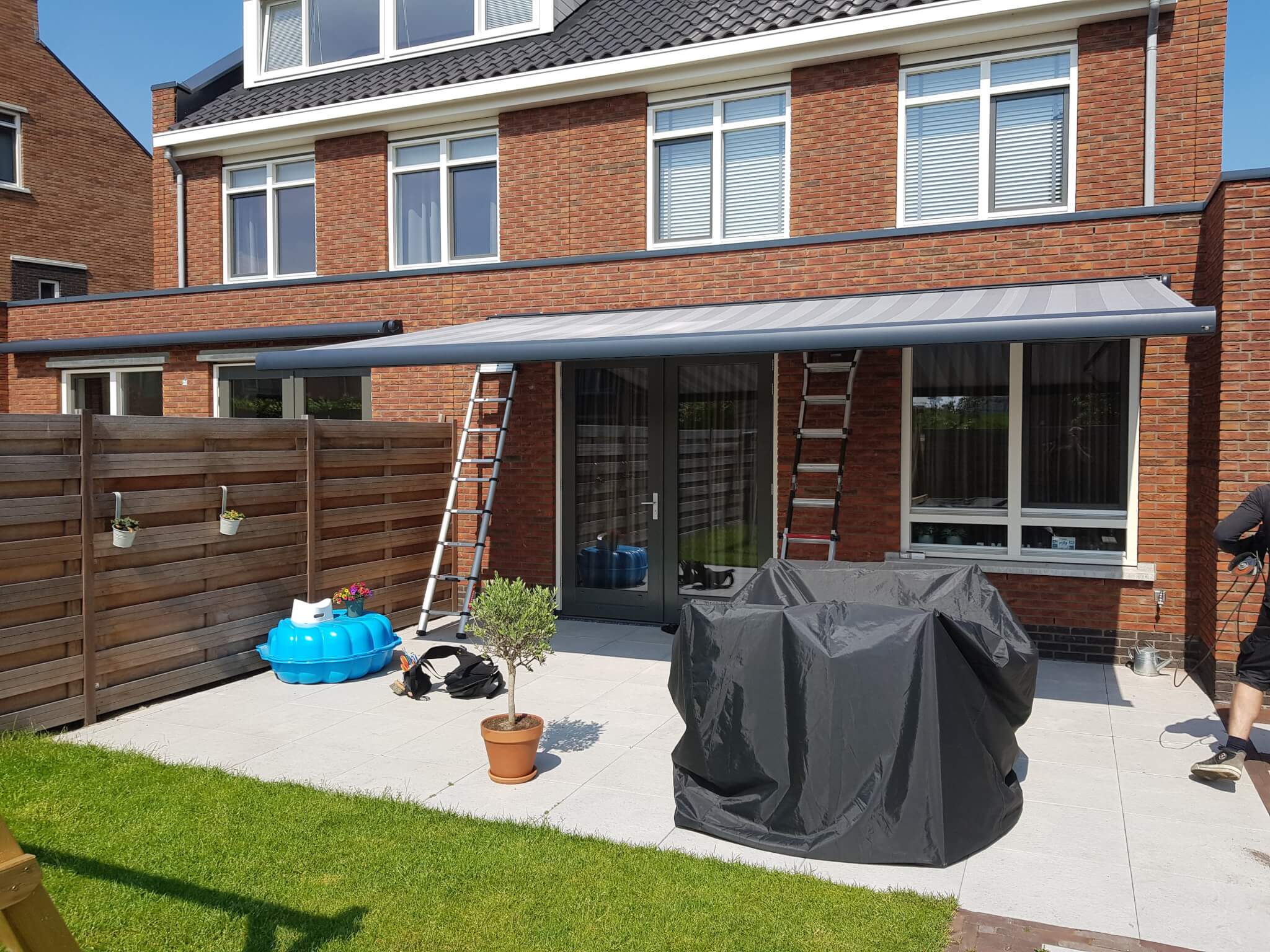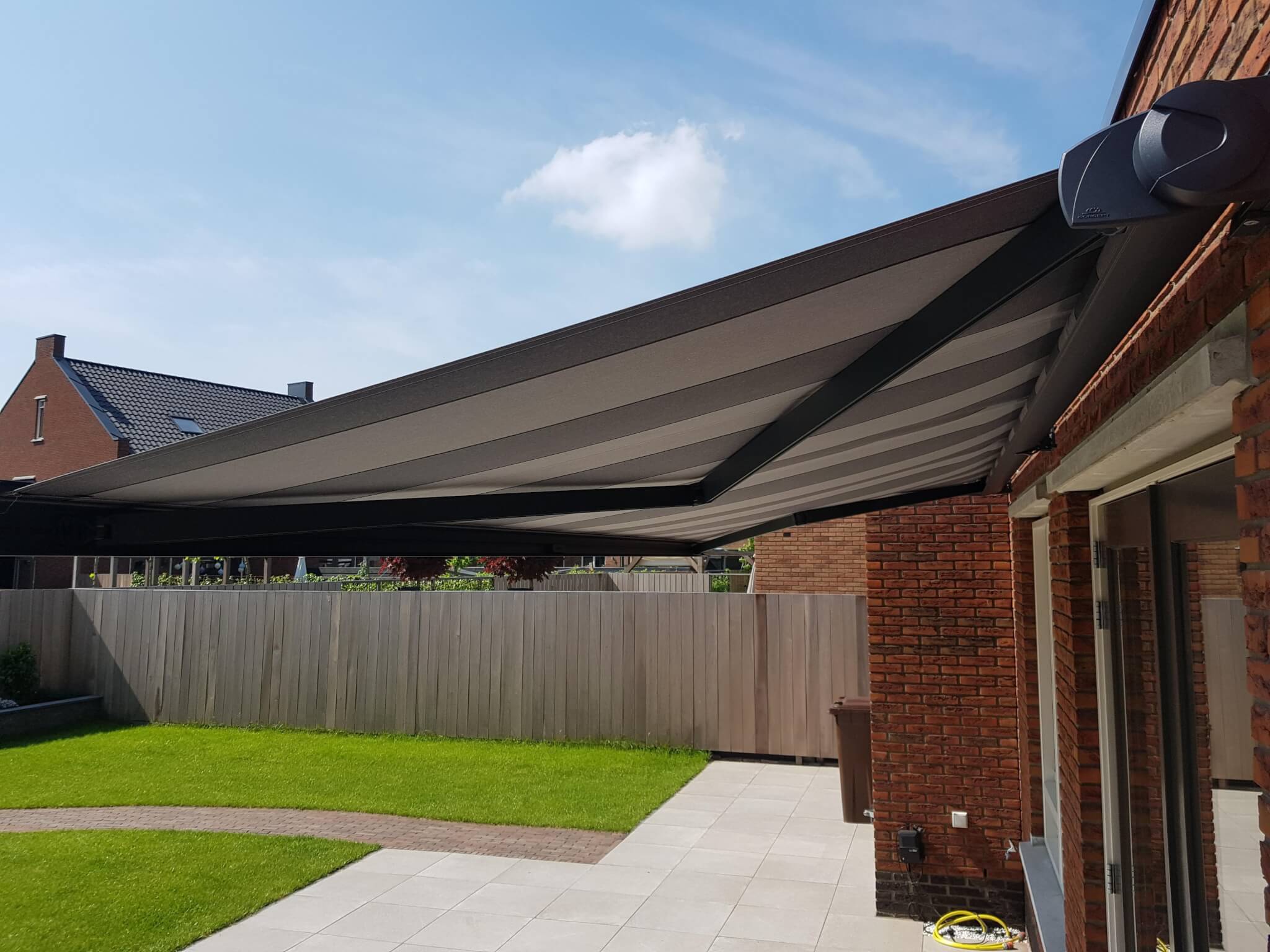 Op deze dag hebben we bij 2 buren een Knikarmscherm geplaatst. Het eerste Knikarmscherm is een Verano Santos met 3,5 meter uitval. Een lekker groot scherm om onder te zitten in de zomermaanden. Het tweede Knikarmscherm dat we hier geplaatst hebben is een Verano Ipanema waarbij de uitval doorgeboord is naar binnen voor een extra stevig scherm. Daarbij is het scherm ook uitgebreid met een somfy eolis 3D windsensor. Wanneer er te veel wind is, zal het scherm dus uit zich zelf naar binnen gaan. Met de windsensor en de stevige montage gaat dit knikarmscherm extra lang mee.