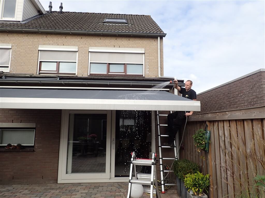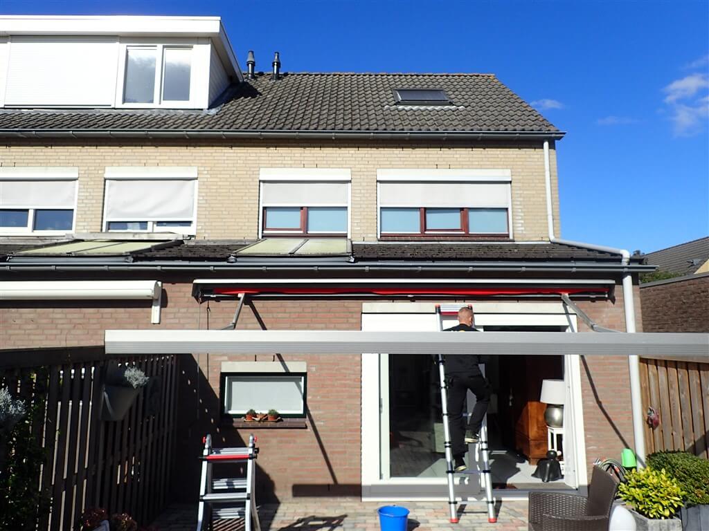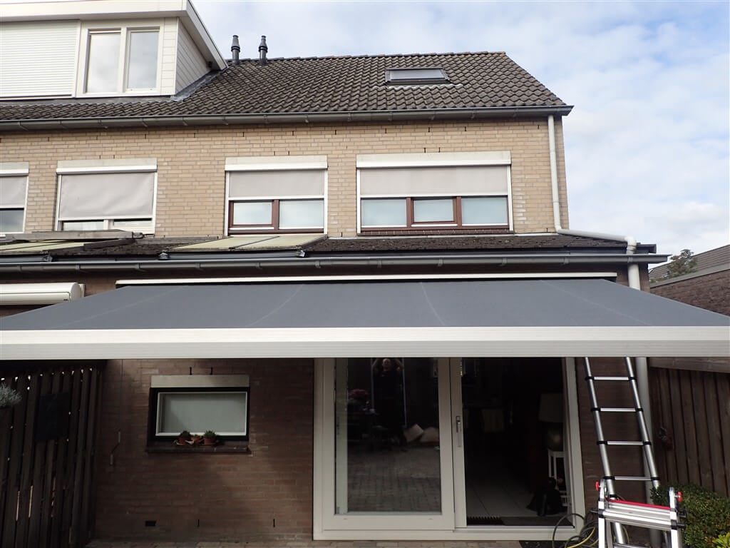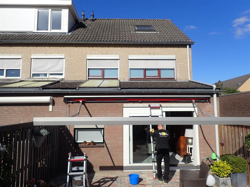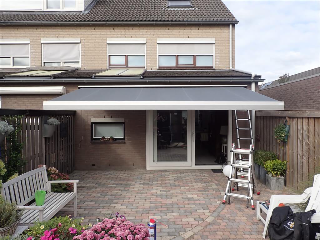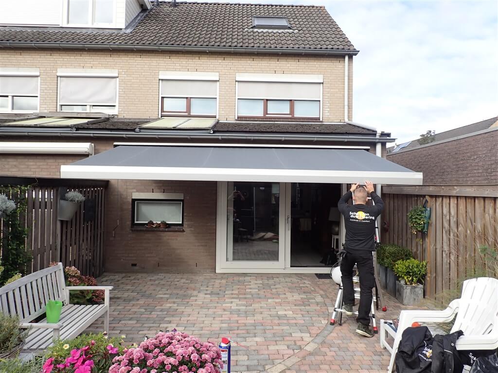 Schaduw Zonwering heeft het doek van een handbediende terrasscherm in Maarssenbroek vervangen omdat deze verkleurd, beschadigd en vervuilt was. Schaduw Zonwering heeft tijdens de inspectie eerst beoordeeld of het ondanks de leeftijd van het terrasscherm nog verstandig was om het doek te vervangen.