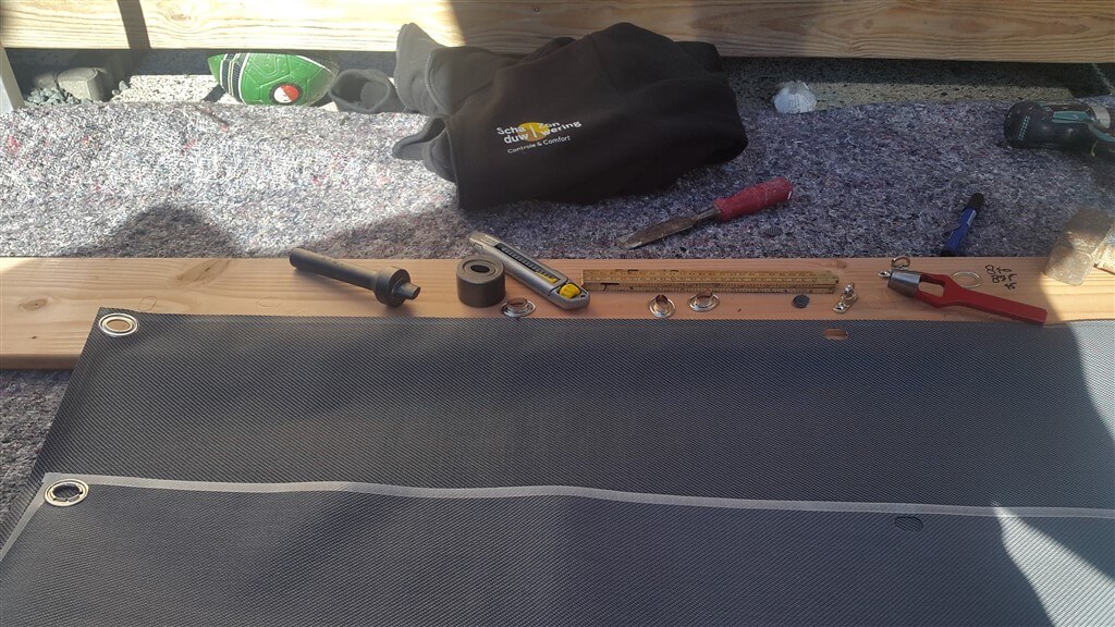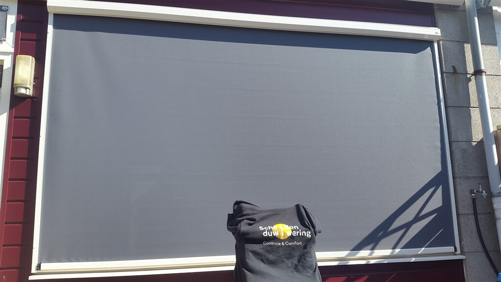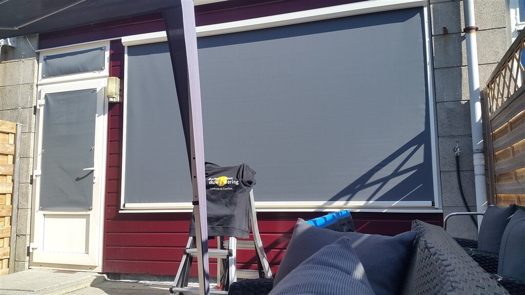 Aan de de zijkant van de zijgeleiders hebben we compriband geplakt, dit is zwart en zet uit, hierdoor sluit het mooi aan op de gevelbetimmering en het metselwerk. Doordat er gekozen is voor een donker kleur doek (antraciet/grijs) wordt het in de woning een stuk donkerder.