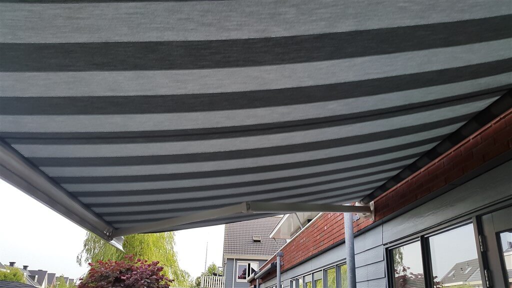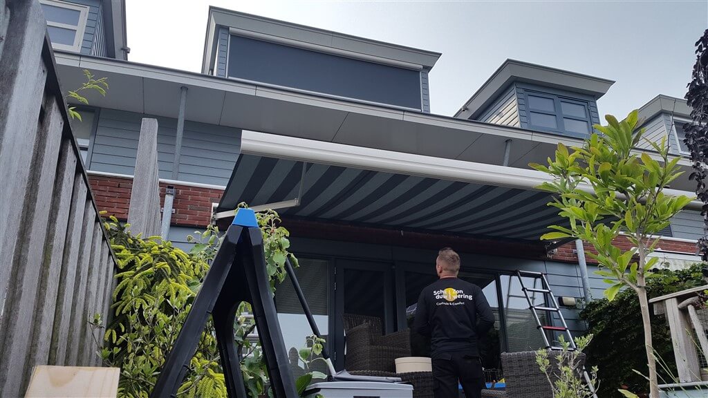 Op de begane grond hebben we aan de uitbouw een semi gesloten terrasscherm gemonteerd met een uitval van 3 meter. Hier is gekozen voor een radio bestuurde motor met afstandbediening. Samen met de opdrachtgever hebben we bedacht om de elektra via de spouwmuur naar achter de gevelbekleding te leiden en hier hebben wij deze aangesloten achter de buiten verlichting, door deze oplossing zijn er geen elektra kabels zichtbaar.
